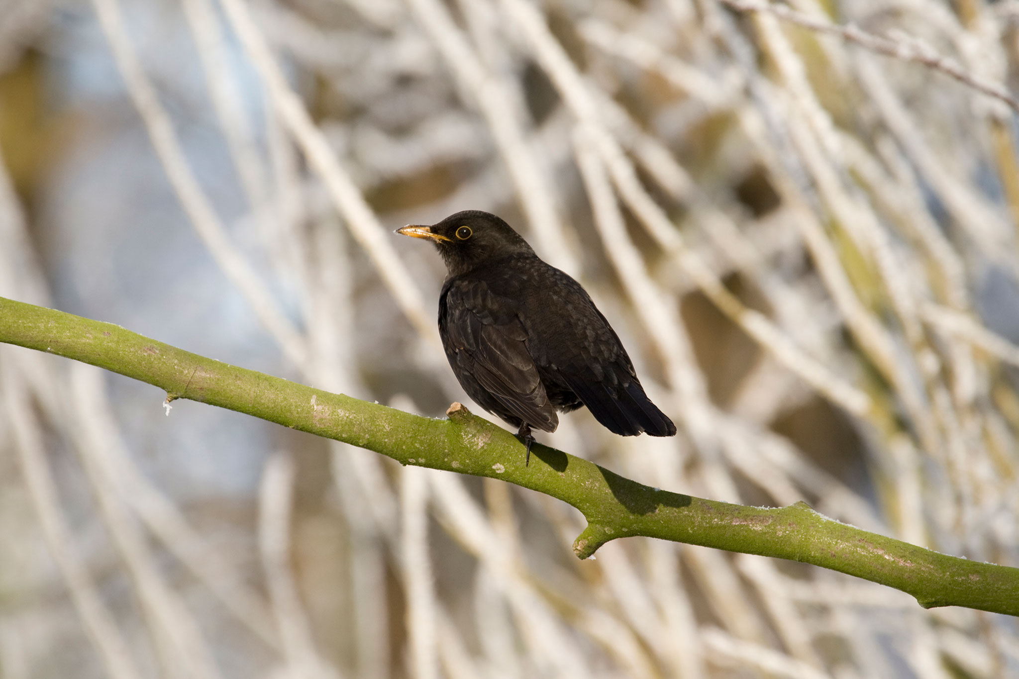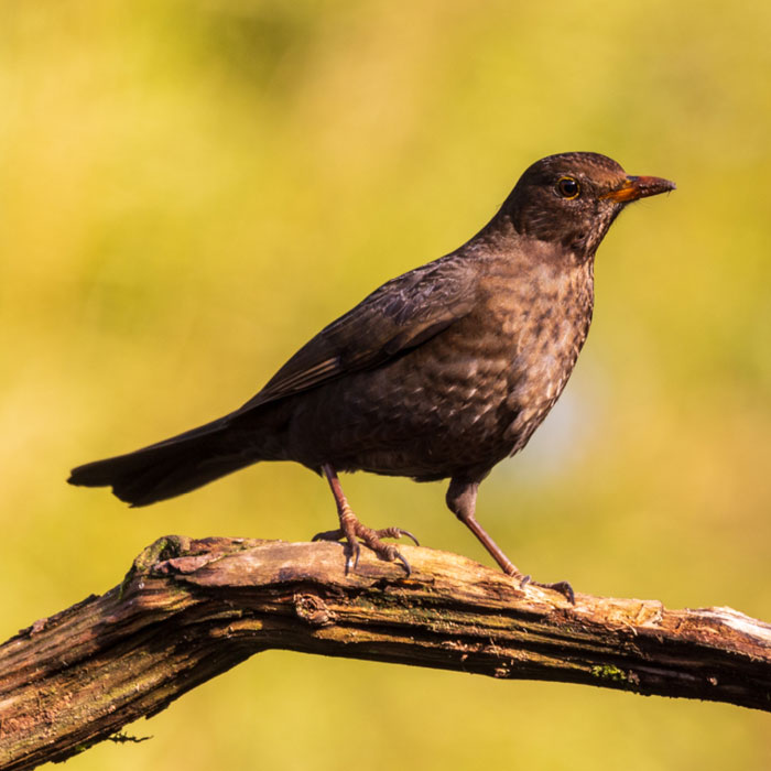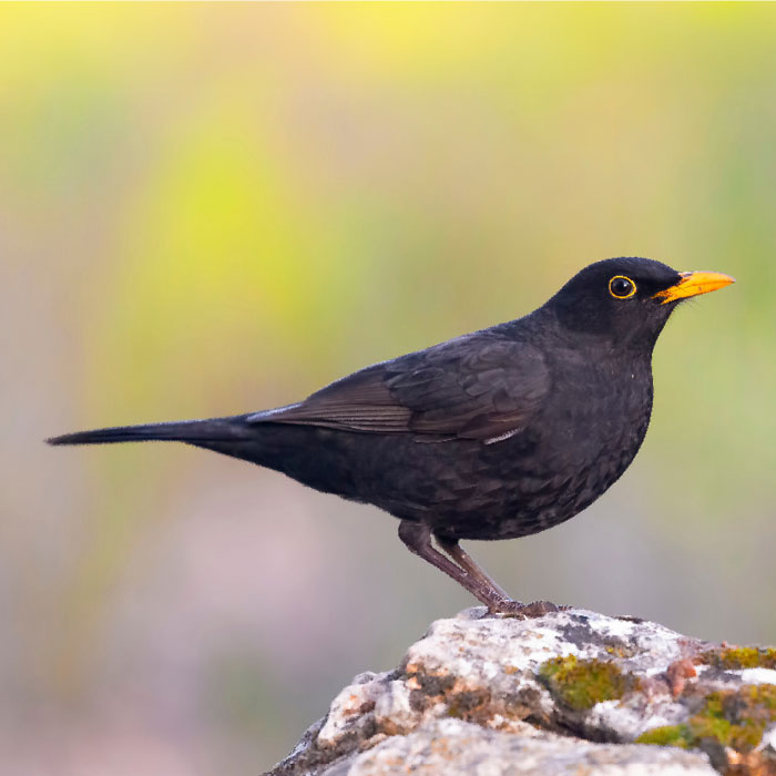 Hannen er sort med gult næb (næsten sort om vinteren) og gule øjenring. Hunnen har en brun overside, rødbrun underside med en lysere strube og plettet bryst.