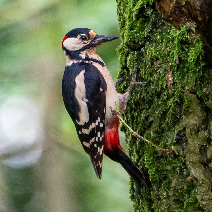 Let at genkende på sin sort-hvide dragt og størrelse, ligesom en drossel, i modsætning til den mindre spætte, der er som en rødhals i størrelsen. Hannerne har en rød plet i nakken, mens hunnerne mangler dette. ungfuglenes hoveder er røde. Den store flagspætte har også en rød del nederst på kroppen, som gør at det ser ud som om at den har røde bukser på.Males have a red patch on the nape (nape is black in females) and juveniles have bright red crowns, similar to adult male Lesser Spotted Woodpeckers, but the size difference alone is usually sufficient to avoid confusion. Lessers have white barring across the wings and back (“lesser are ladder backs”) rather than the white shoulder panels of the Great Spotted. Great Spotted Woodpeckers also have red undersides between the legs and the tail, creating the impression that they are wearing red shorts!