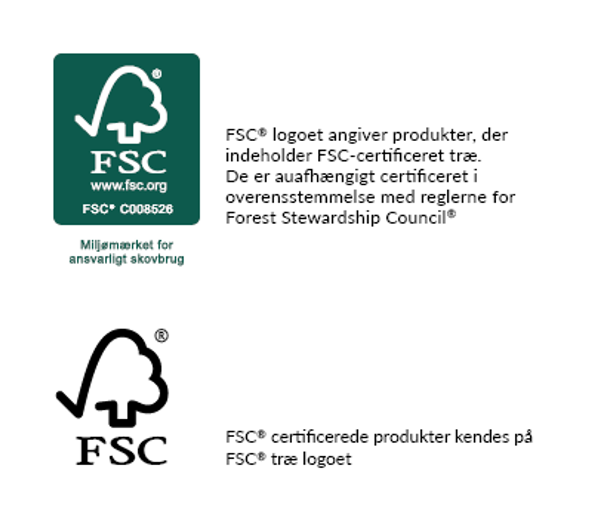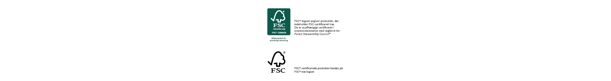 FSC®-mærket signalerer, at disse produkter indeholder træ fra eksemplarisk forvaltede skove. Disse certificeres uafhængigt og i overensstemmelse med reglerne fra Forest Stewardship Council®. FSC-certificerede produkter kan genkendes ved FSC-trælogoet.