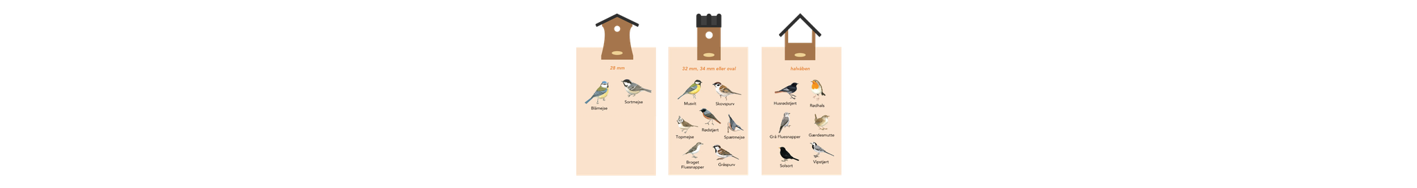Du vil I vores serie af redekasser se en stor variation af redekasser, bygget i forskellige materialer og størrelser for at hjælpe med at give de forskellige arter det, de har behov for. Størrelsen på indgangshullet er f.eks. en meget vigtig faktor da ikke alle størrelser er passende til alle fugle. Når du vælger en redekasse kan du anvende følgende vejledning, så du kan give fuglene det rigtige hjem.